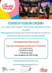 L’Association des Concerts de Poche organise cette année un projet de chant choral avec l’école élémentaire de Léré.À cette occasion, elle recherche une dizaine d’adultes qui souhaiteraient découvrir ou redécouvrir le chant choral aux côtés des élèves de CM1 et CM2.