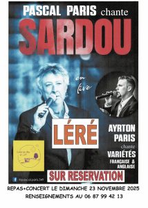 Le Comité des Fêtes de LERE vous propose DIMANCHE 23 NOVEMBRE, un repas concert. Pascal Paris chantera Sardou et Ayrton Paris chantera des variétés françaises et anglaises.⚠️Vous avez jusqu’à vendredi 7 novembre pour réserver votre repas au 06 87 99 42 13